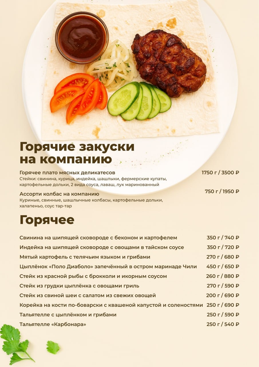 Стейки из свинины, курицы, индейки, шашлыки, фермерские купаты, картофельные дольки, соусы, лаваш, маринованный лук